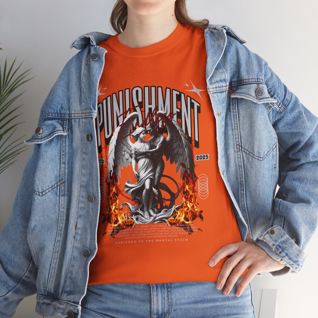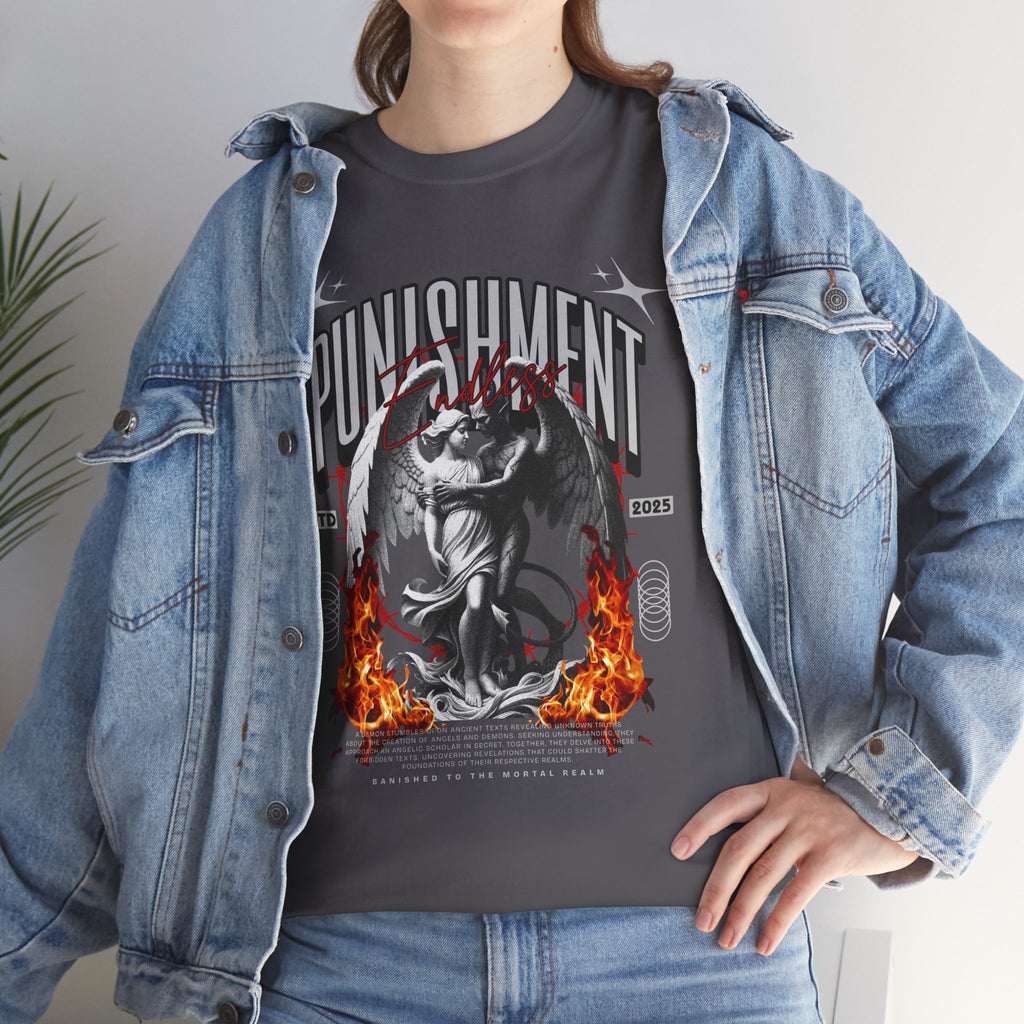 This powerful and dramatic graphic features a striking embrace between an angel and a demon, reminiscent of classical statuary, symbolizing eternal conflict or forbidden love. Encircling the figures are barbed wire and fierce flames, underscoring the themes of "Endless Punishment" boldly displayed above. The distressed "PUNISHMENT" text, along with "ESTD 2025," gives the design a modern, gritty, and timeless feel. Ideal for streetwear, alternative fashion, and anyone drawn to mythological or dark romantic themes.